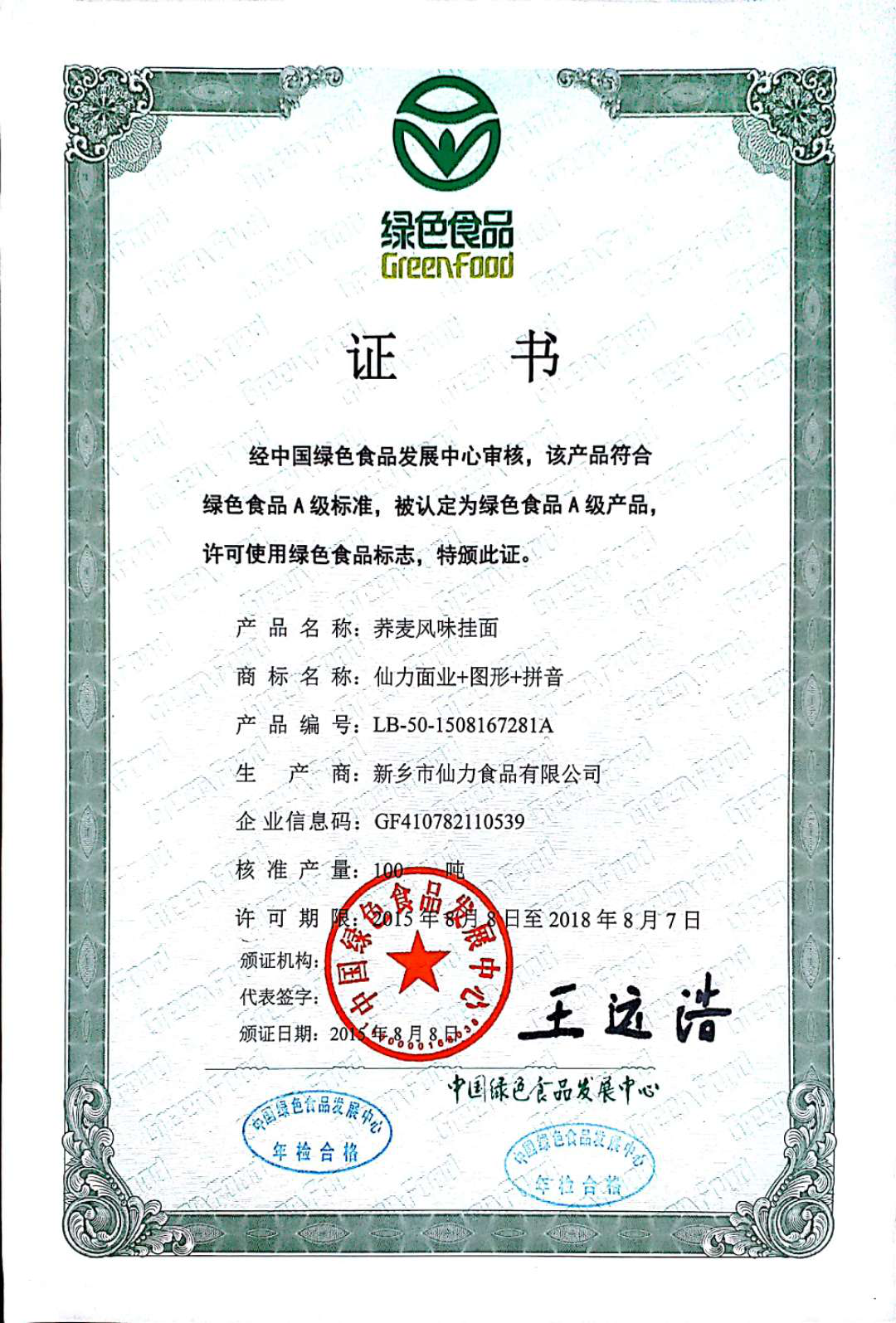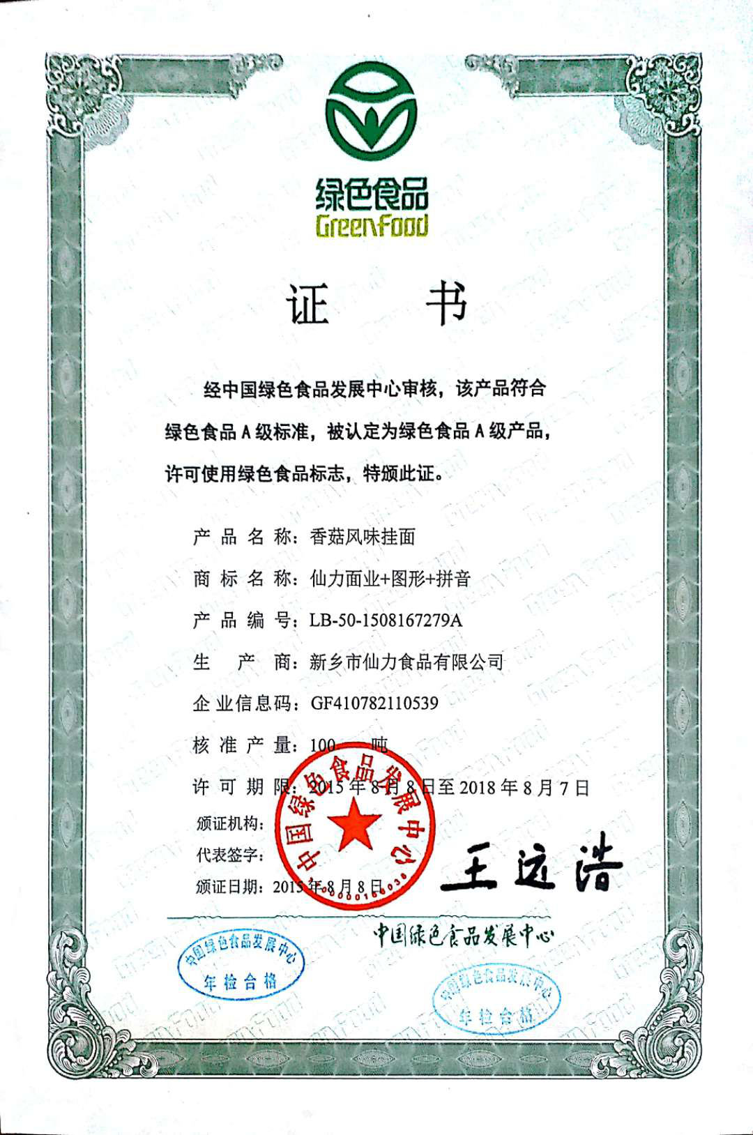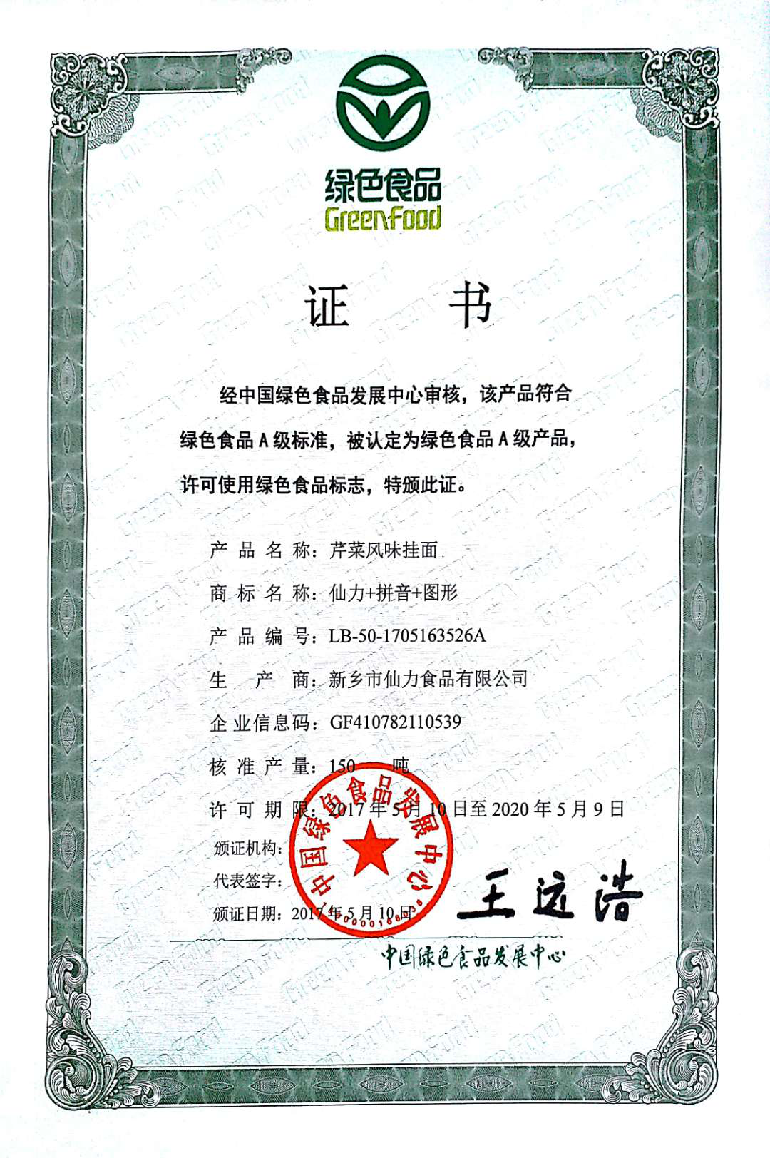 綠色風(fēng)味掛面-綠色食品證書