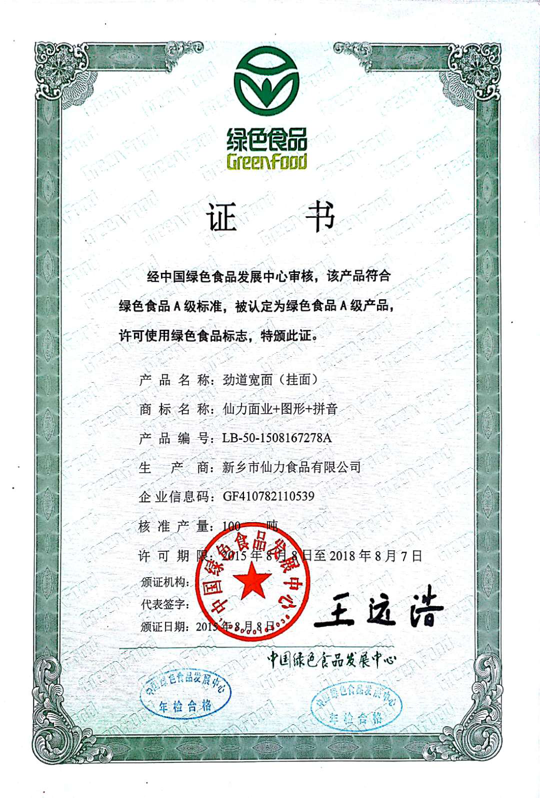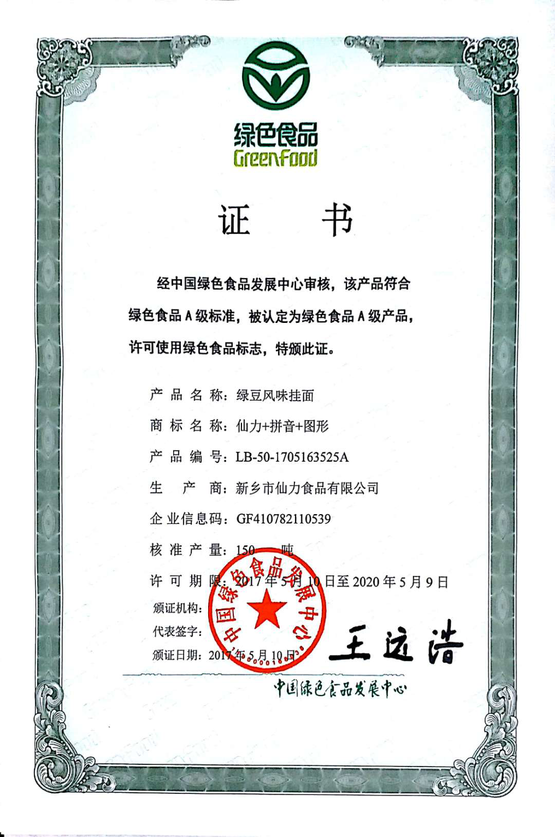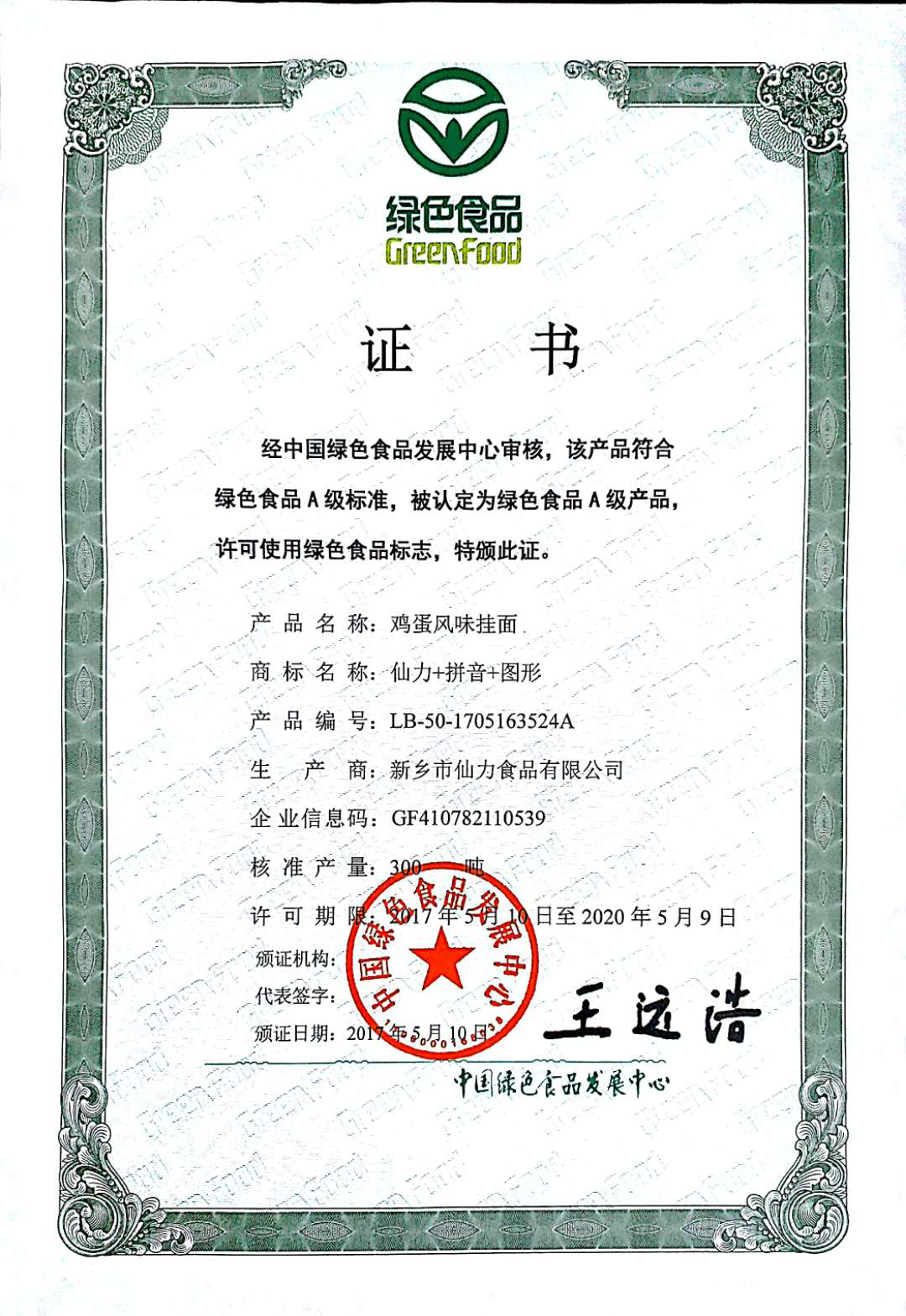 綠色風(fēng)味掛面-綠色食品證書