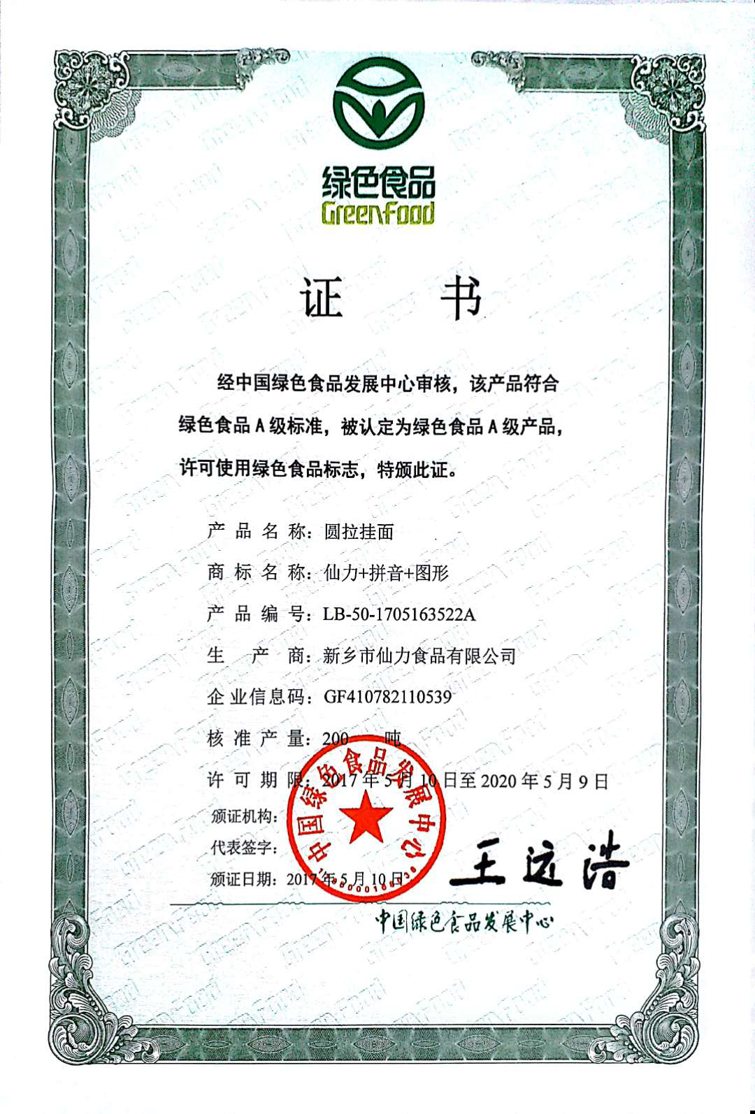 圓拉掛面-綠色食品證書