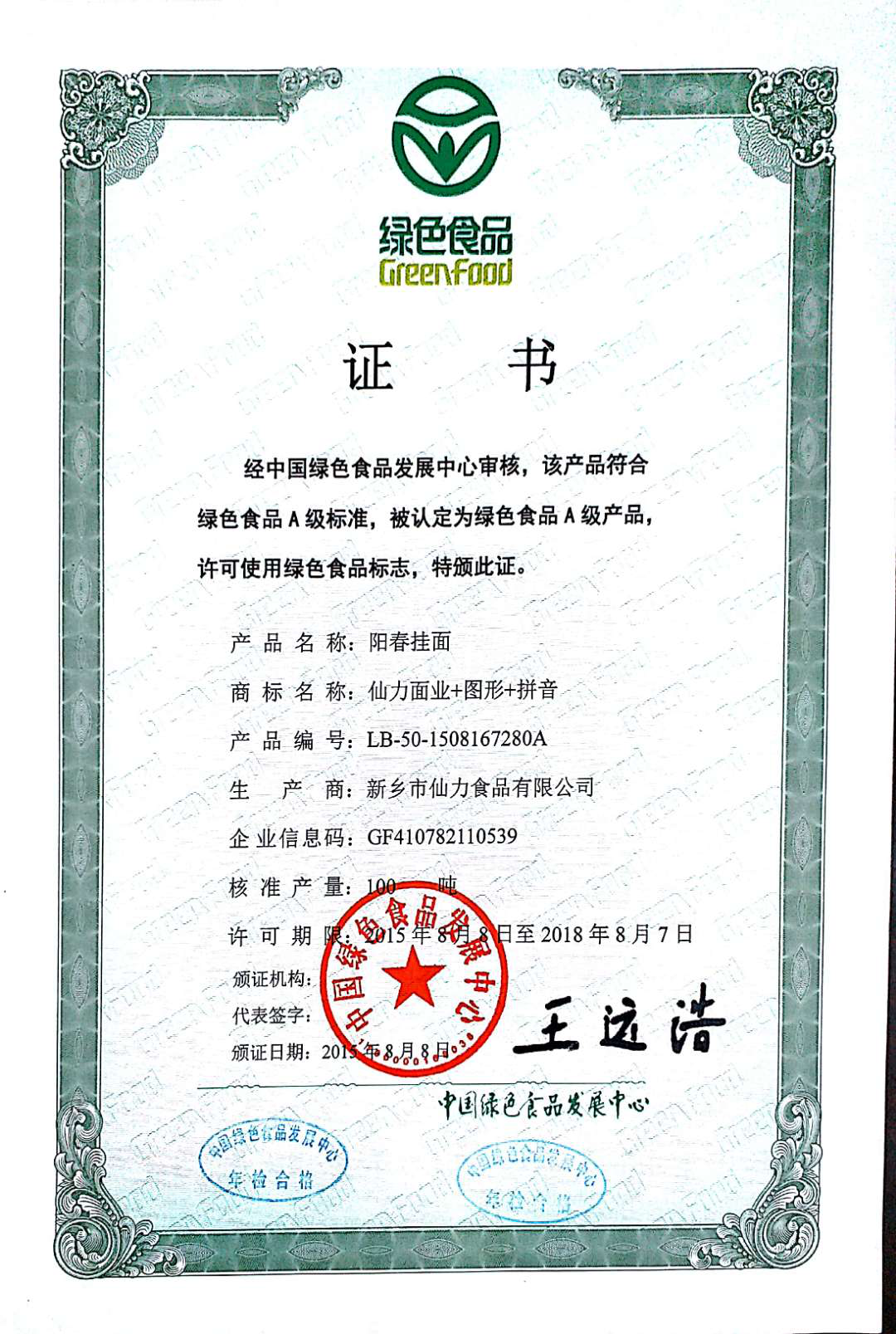 陽(yáng)春掛面-綠色食品證書